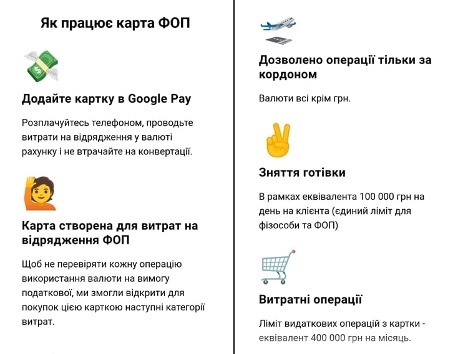 Також із цієї карти можна знімати готівку у валюті з іноземного рахунку підприємця у банкоматах за кордоном.